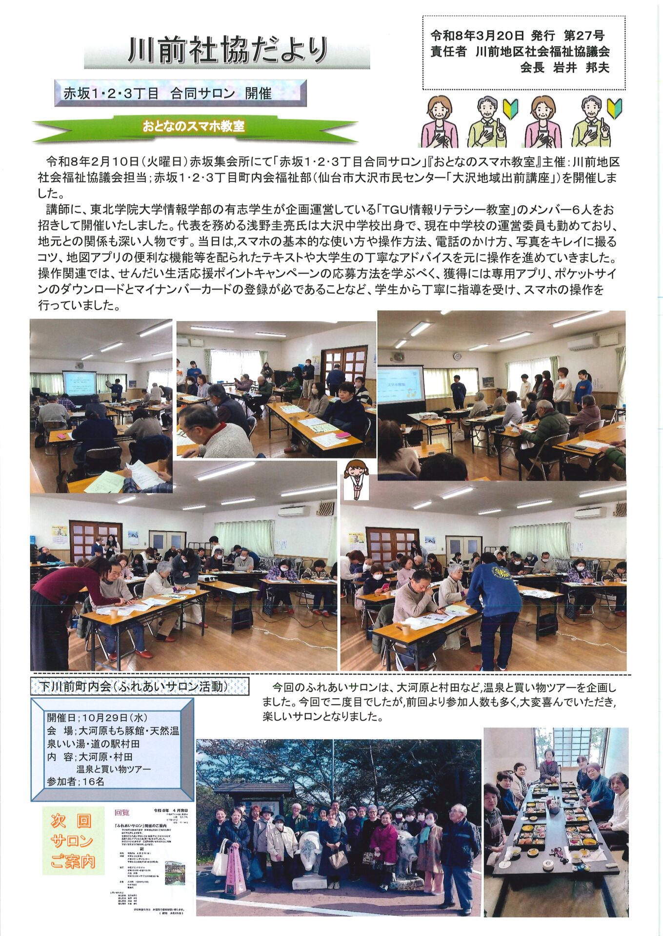 Home活動を知りたい地区社協について青葉区宮城支部川前地区社会福祉協議会 川前かわまえ地区社会福祉協議会 基本情報と主な活動レポート 基本情報 (地区社協活動シート) サロン開催状況一覧 広報紙 令和8年3月発行 令和7年11月発行 令7年8月発行 令和6年12月発行 令和6年8月発行 令和5年11月発行 令和5年8月発行 令和5年2月発行 令和4年8月発行 令和4年2月発行 令和3年9月発行 令和3年8月発行 令和3年3月発行 令和2年10月発行 令和2年3月発行 令和元年12月発行 令和元年8月発行 圏域 (主な町名) 赤坂1~3丁目 高野原1~4丁目 芋沢字の一部 連合町内会 川前地区連合町内会 学区 川前小,大沢中 地域包括支援センター 大沢広陵