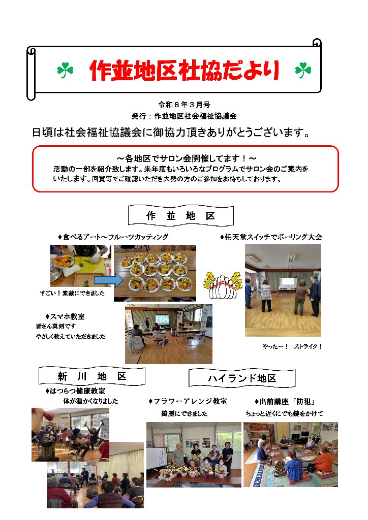 Home活動を知りたい地区社協について青葉区宮城支部作並地区社会福祉協議会 作並さくなみ地区社会福祉協議会 基本情報と主な活動レポート 基本情報 (地区社協活動シート) サロン開催状況一覧 広報紙 令和8年3月発行 令和7年9月発行 令和6年9月発行 令和6年3月発行 令和5年9月発行 令和5年3月発行 令和4年9月発行 令和3年9月発行 令和3年3月発行 令和2年9月発行 令和2年3月発行 令和元年8月発行 圏域 (主な町名) 作並字 新川ニッカ(全域) 連合町内会 作並小学区連合町内会 学区 上愛子小,広陵中 地域包括支援センター 大沢広陵