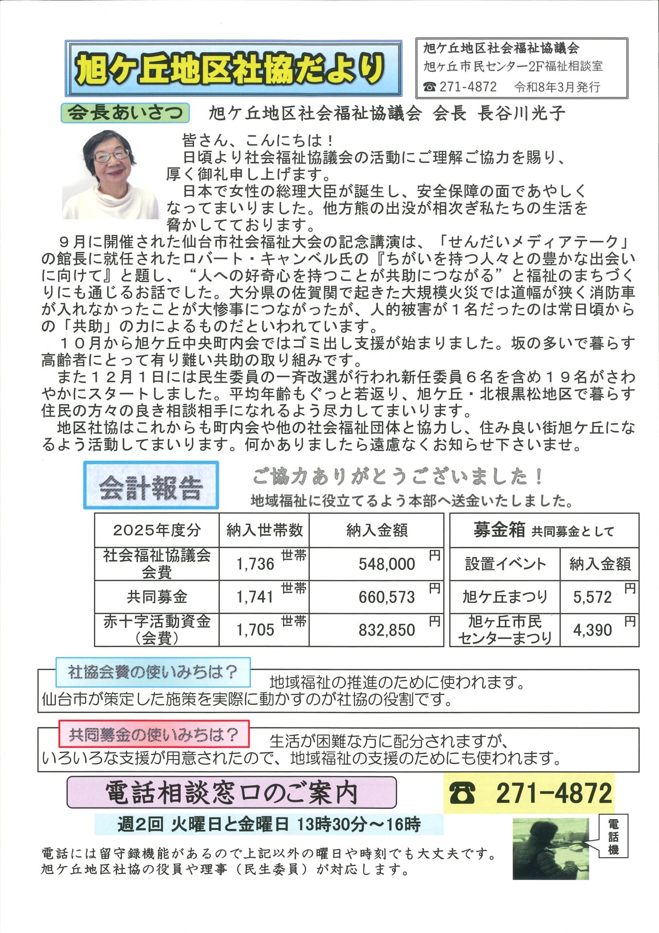 Home活動を知りたい地区社協について青葉区旭ケ丘地区社会福祉協議会 旭ヶ丘あさひがおか地区社会福祉協議会 基本情報と主な活動レポート 基本情報 (地区社協活動シート) サロン一覧 (地区社協活動シート別紙) 広報紙 令和8年3月発行 令和7年3月発行 令和6年3月発行 令和5年3月発行 令和4年3月発行 令和3年3月発行 令和2年2月発行 平成31年2月発行 圏域 (主な町名) 旭ケ丘1丁目~4丁目 北根黒松 連合町内会 旭ケ丘南部連合町内会,旭ケ丘町内会連合会 学区 旭丘小,台原小,台原中 地域包括支援センター 台原