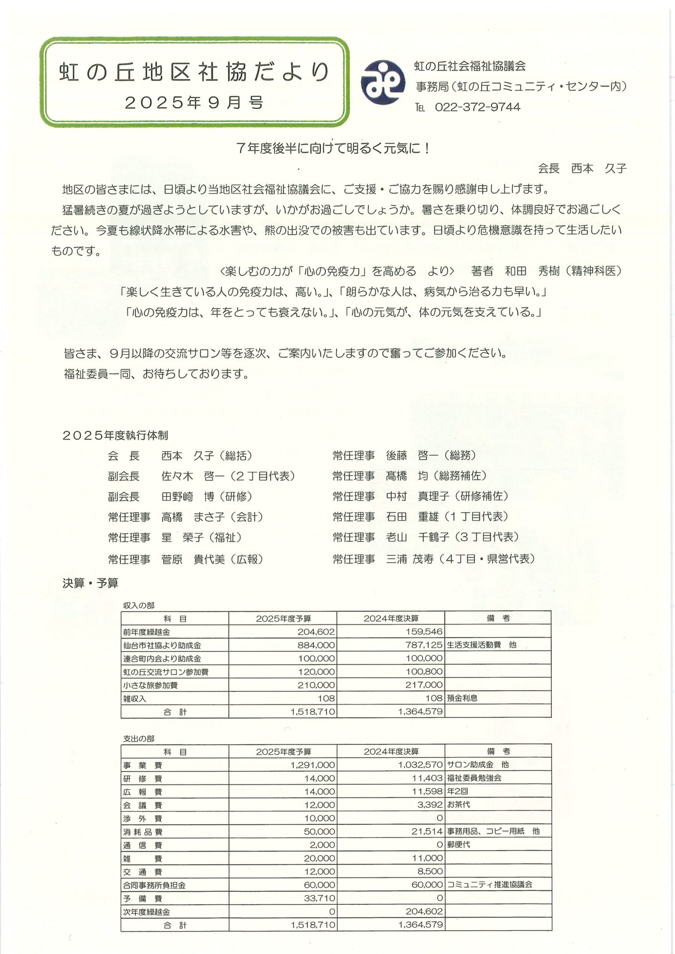 Home活動を知りたい地区社協について泉区虹の丘地区社会福祉協議会 虹の丘にじのおか地区社会福祉協議会 基本情報と主な活動レポート 基本情報 (地区社協活動シート) サロン一覧 (地区社協活動シート別紙) 広報紙 令和7年9月発行 令和7年3月発行 令和6年9月発行 令和6年3月発行 令和5年8月発行 令和5年3月発行 令和4年3月発行 令和3年3月発行 令和2年3月発行 圏域 (主な町名) 虹の丘1丁目~4丁目 連合町内会 虹の丘連合町内会 学区 虹の丘小,加茂中 地域包括支援センター 加茂,虹の丘
