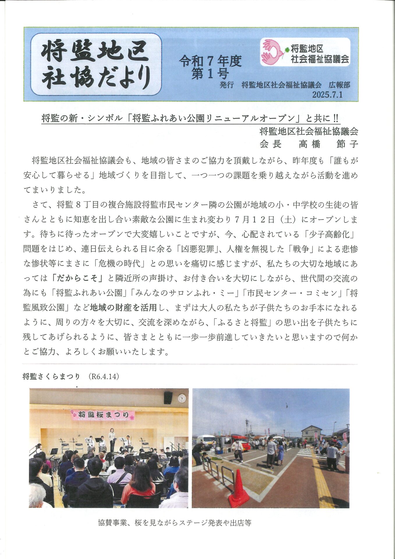 Home活動を知りたい地区社協について泉区将監地区社会福祉協議会 将監しょうげん地区社会福祉協議会 基本情報と主な活動レポート 基本情報 (地区社協活動シート) サロン一覧 (地区社協活動シート別紙) 広報紙 令和7年7月発行 令和5年5月発行 令和2年9月発行 令和元年5月発行 詳しく見る 圏域 (主な町名) 将監1丁目~13丁目 連合町内会 将監町内会自治会連絡協議会 学区 将監小,将監西小,将監中央小,将監中,将監東中 地域包括支援センター 将監