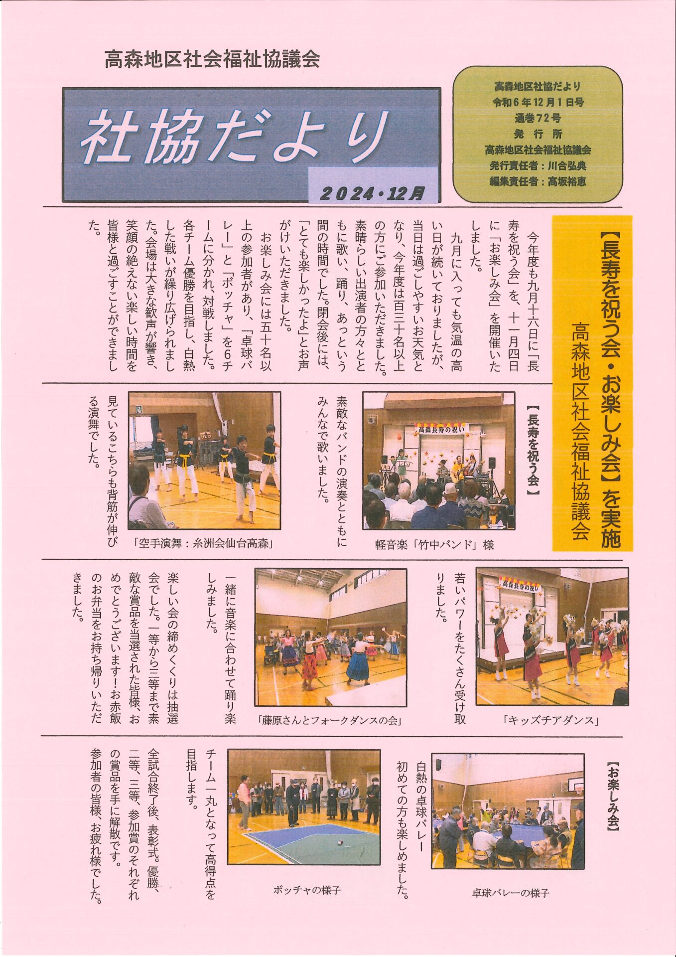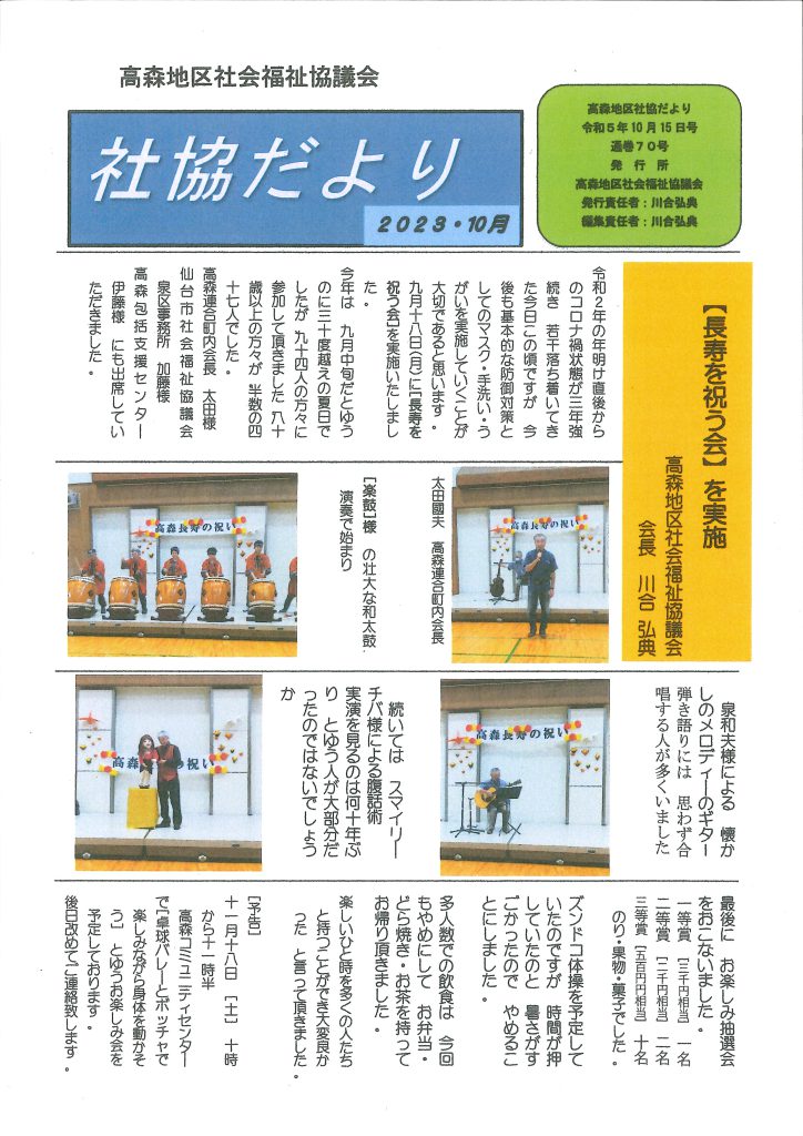 Home活動を知りたい地区社協について泉区高森地区社会福祉協議会 高森たかもり地区社会福祉協議会 基本情報と主な活動レポート 基本情報 (地区社協活動シート) サロン一覧 (地区社協活動シート別紙) 広報紙 令和6年12月発行 令和5年10月発行 令和5年6月発行 令和4年11月発行 令和4年5月発行 令和3年5月発行 圏域 (主な町名) 高森1丁目~4丁目 連合町内会 高森連合町内会 学区 高森小,高森中 地域包括支援センター 高森