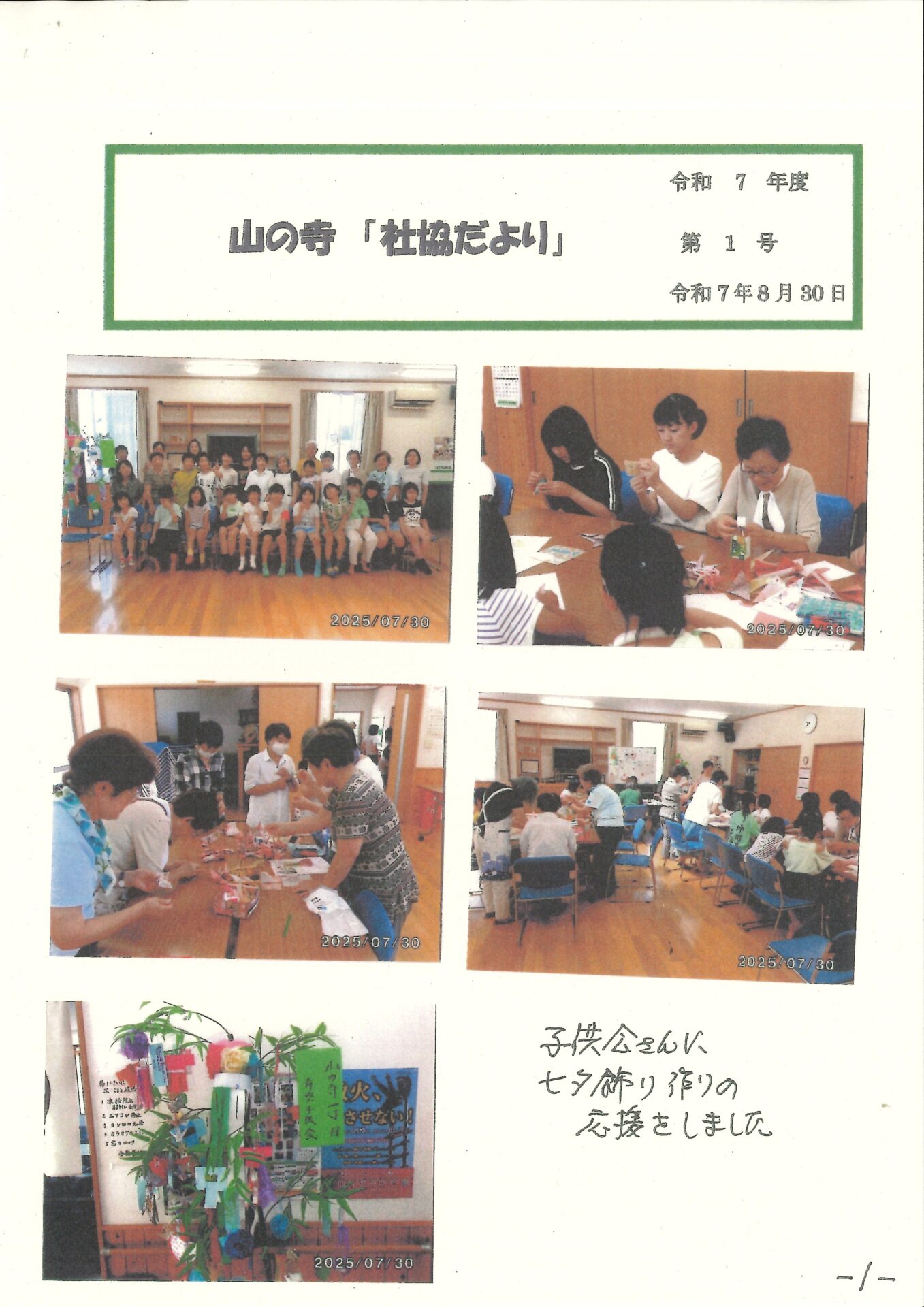 Home活動を知りたい地区社協について泉区山の寺地区社会福祉協議会 山の寺やまのてら地区社会福祉協議会 基本情報と主な活動レポート 基本情報 (地区社協活動シート) サロン一覧 (地区社協活動シート別紙) 広報紙 令和7年8月発行 令和7年1月発行 令和6年11月発行 令和6年10月発行 令和4年9月発行 令和4年7月発行 令和4年3月発行 令和4年1月発行 令和3年7月発行 圏域 (主な町名) 山の寺1丁目~3丁目 連合町内会 山の寺連合町内会 学区 向陽台小,向陽台中 地域包括支援センター 向陽台