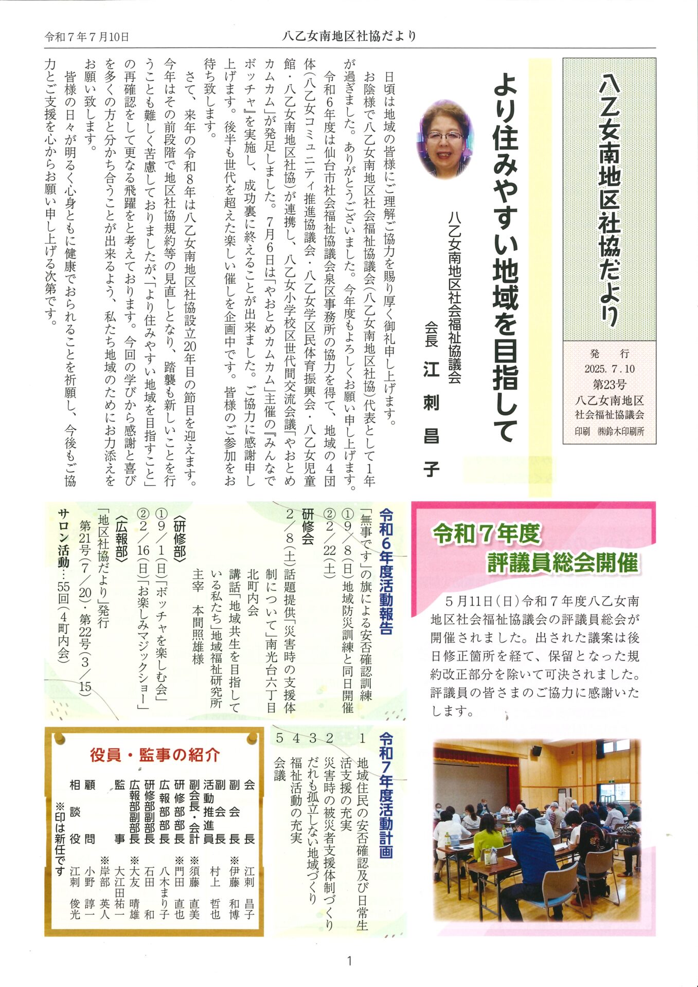 Home活動を知りたい地区社協について泉区八乙女南地区社会福祉協議会 八乙女南やおとめみなみ地区社会福祉協議会 基本情報と主な活動レポート 基本情報 (地区社協活動シート) サロン一覧 (地区社協活動シート別紙) 広報紙 令和7年10月発行 令和7年3月発行 令和6年7月発行 令和6年2月発行 令和5年7月発行 令和5年1月発行 令和4年7月発行 令和4年2月発行 圏域 (主な町名) 南光台4丁目の一部 南光台5丁目~6丁目の一部 旭丘堤1丁目~2丁目の一部 東黒松 七北田字八乙女1、21 連合町内会 八乙女地区連合町内会 学区 八乙女小,八乙女中 地域包括支援センター 八乙女,南光台