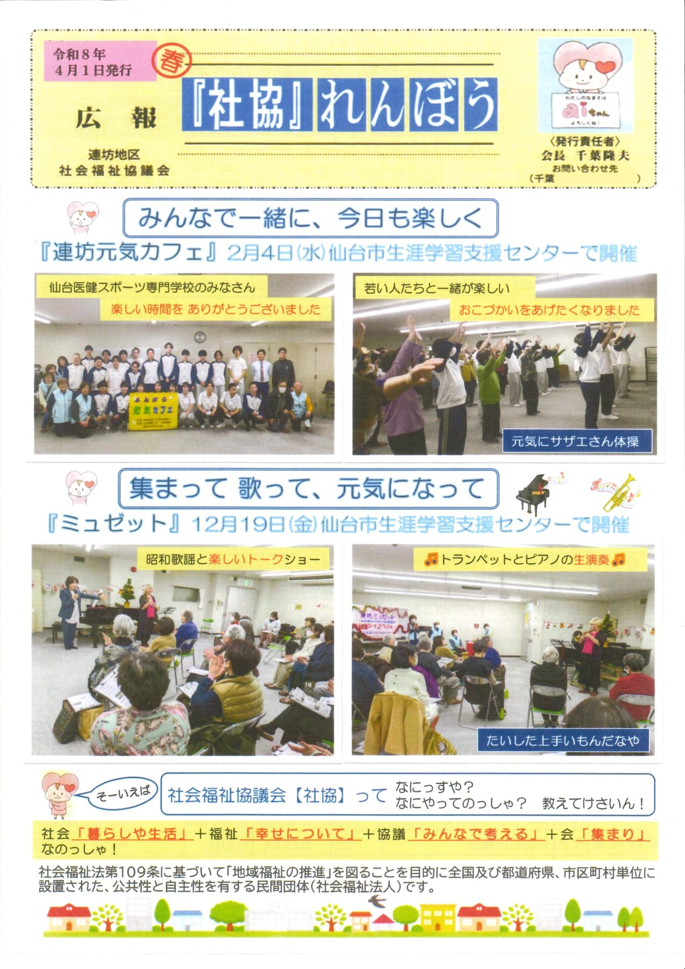 Home活動を知りたい地区社協について若林区連坊地区社会福祉協議会 連坊れんぼう地区社会福祉協議会 基本情報と主な活動レポート 基本情報 (地区社協活動シート) サロン一覧 (地区社協活動シート別紙) 広報紙 令和8年4月発行 令和7年10月発行 令和7年4月発行 令和5年9月発行 令和5年3月発行 令和4年9月発行 令和4年3月発行 令和3年9月発行 令和3年3月発行 圏域 (主な町名) 裏柴田町 表柴田町 三百人町 新寺1丁目~5丁目 成田町 二軒茶屋 元茶畑 連坊1丁目~2丁目 東九番丁 連坊小路 連合町内会 連坊地区町内会連合会 学区 連坊小路小,南小泉小,東華中,五橋中,南小泉中 地域包括支援センター 五橋,榴岡,遠見塚