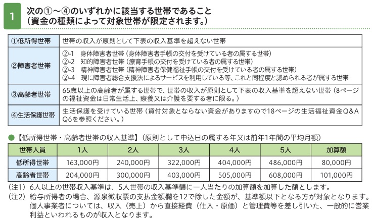 (宮城県社会福祉協議会発行「生活福祉資金のご案内」より抜粋)。 - 生活保護世帯は、福祉事務所(保護課)の意見書が必要になります。